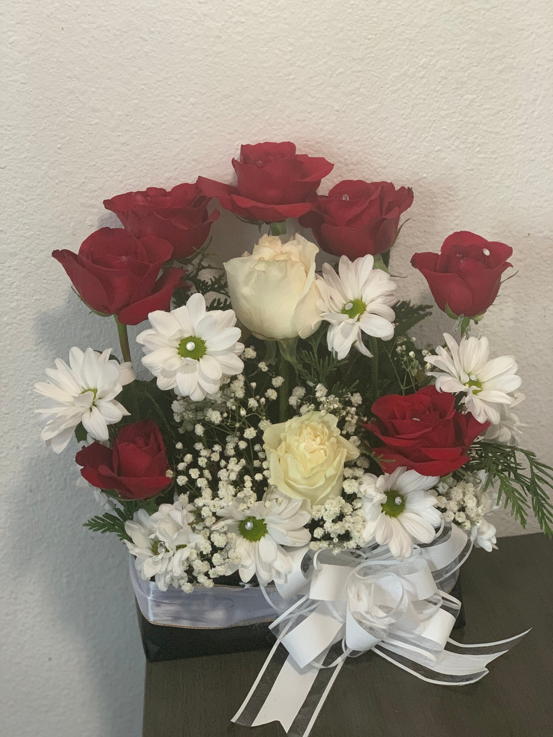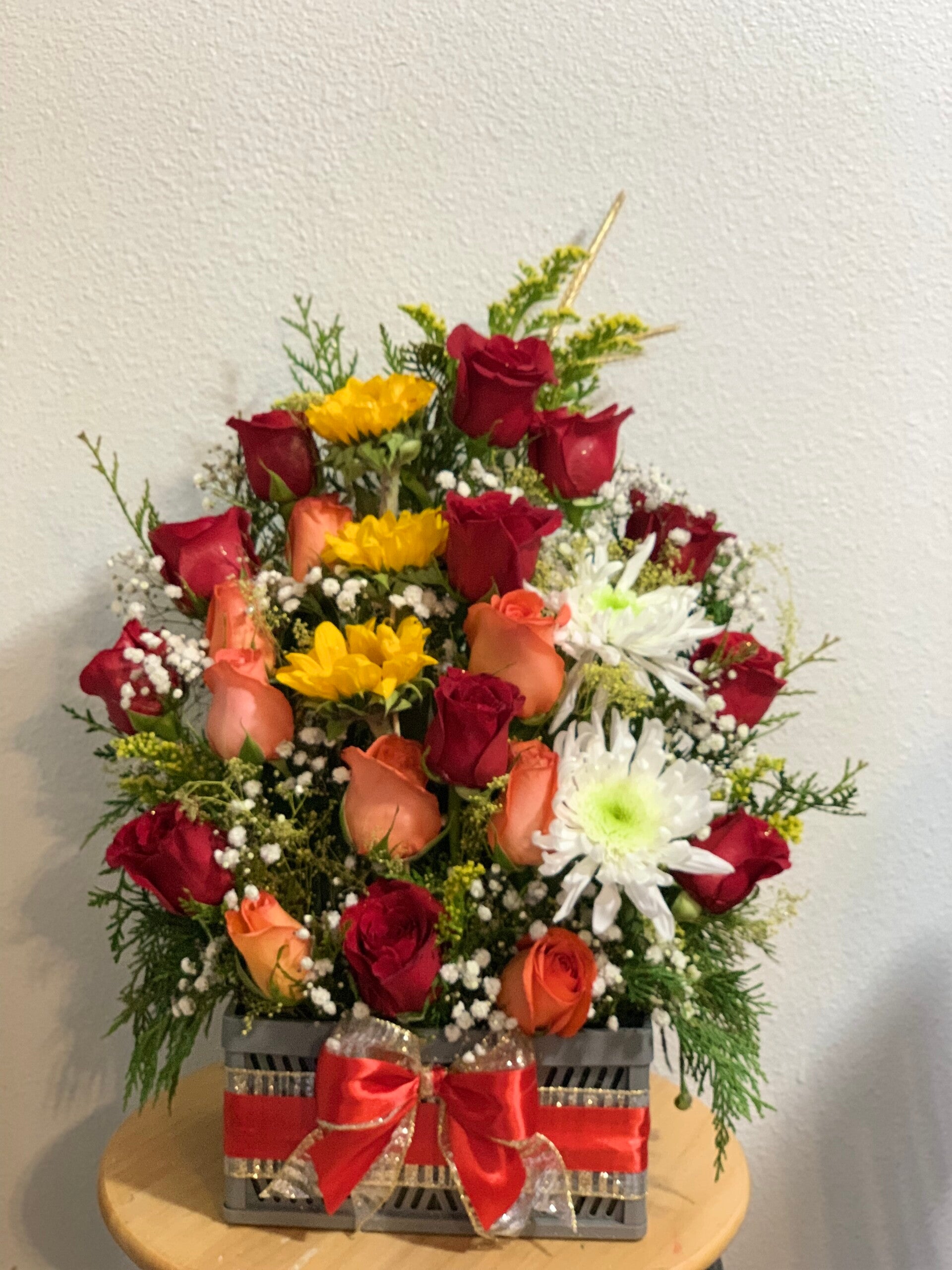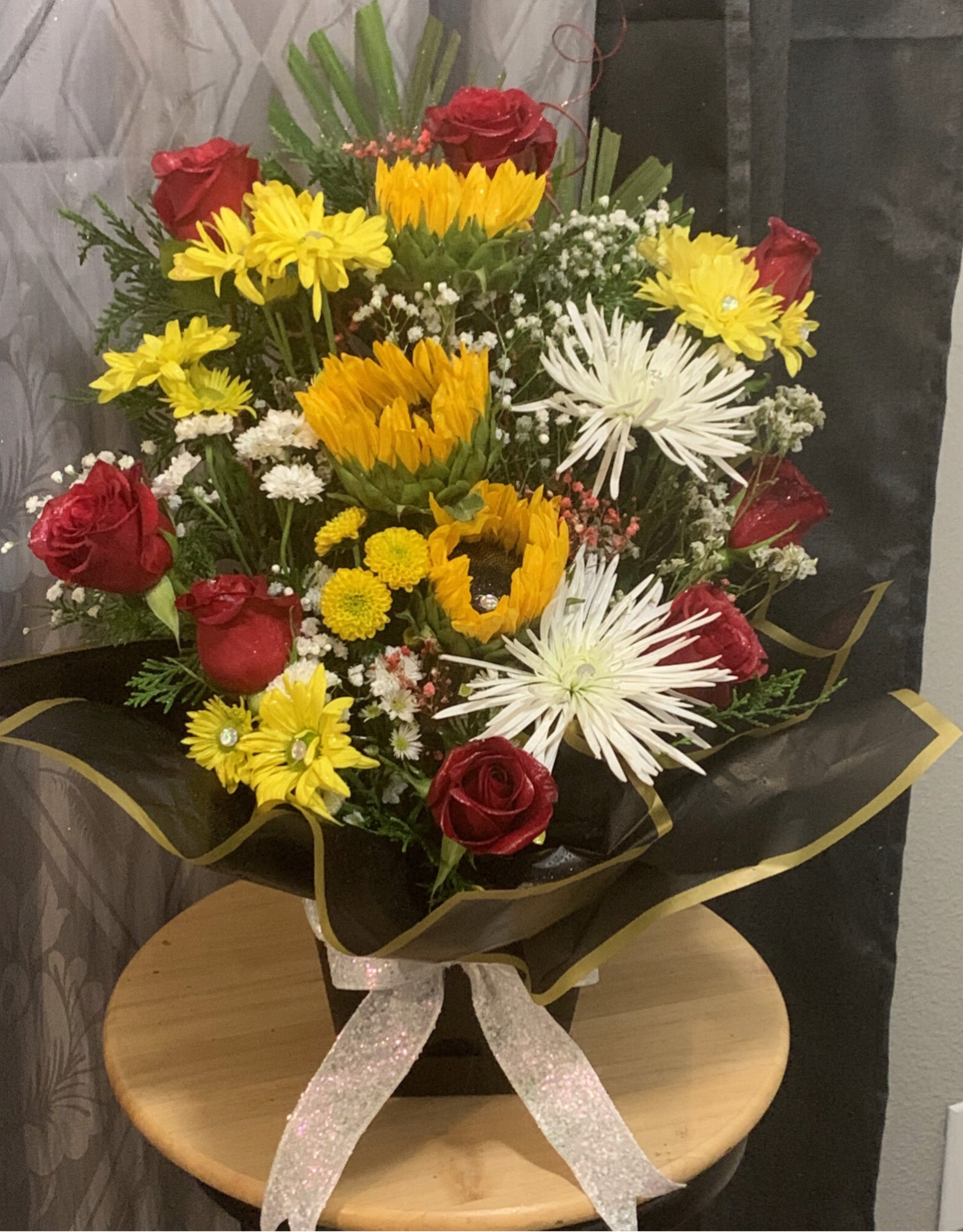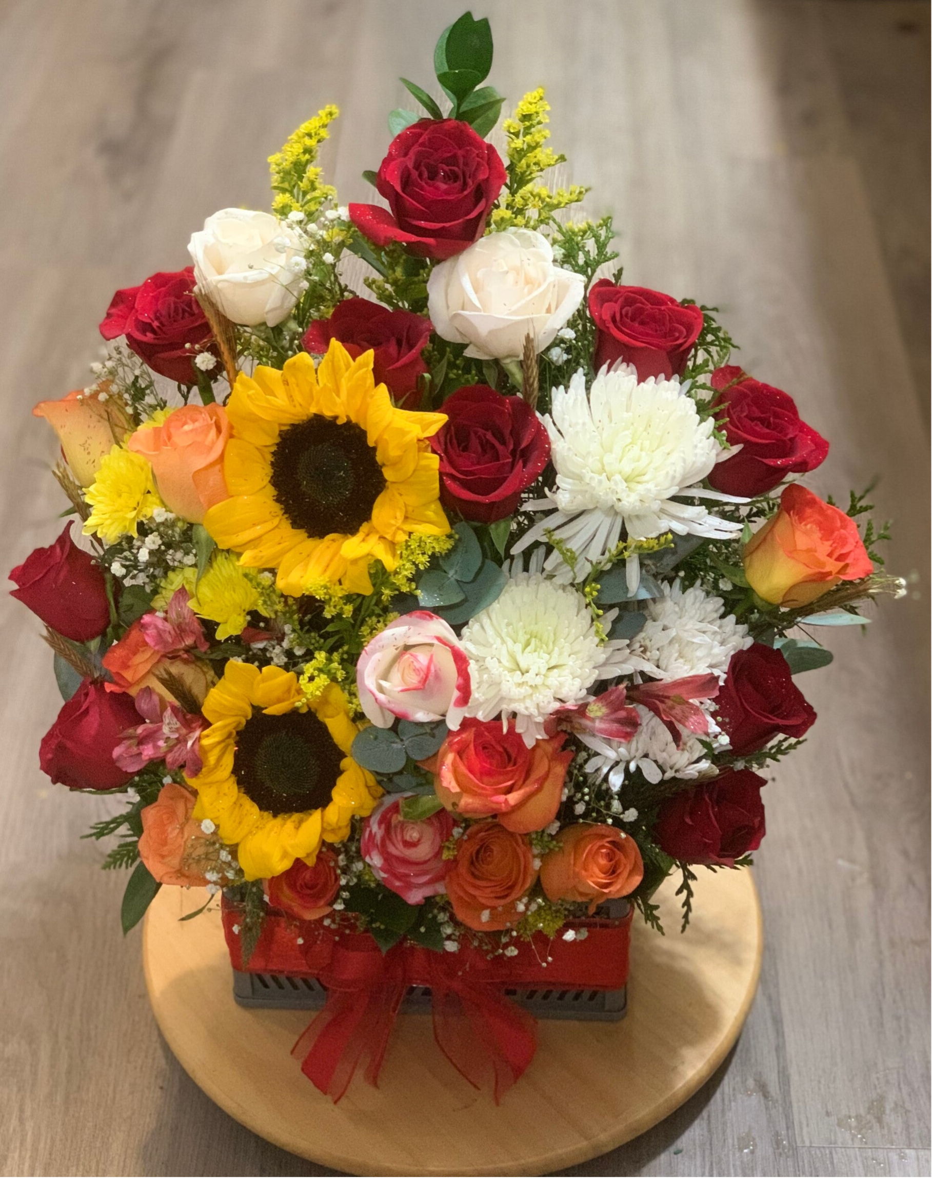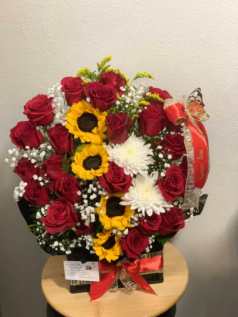 Ilumina tu día con nuestro elegante Arreglo "Amanecer". Diseñado para brindar alegría y calidez, este arreglo radiante cuenta con una mezcla armoniosa de girasoles, rosas rojas y flores blancas, cuidadosamente dispuestas para crear una explosión de color y positividad.