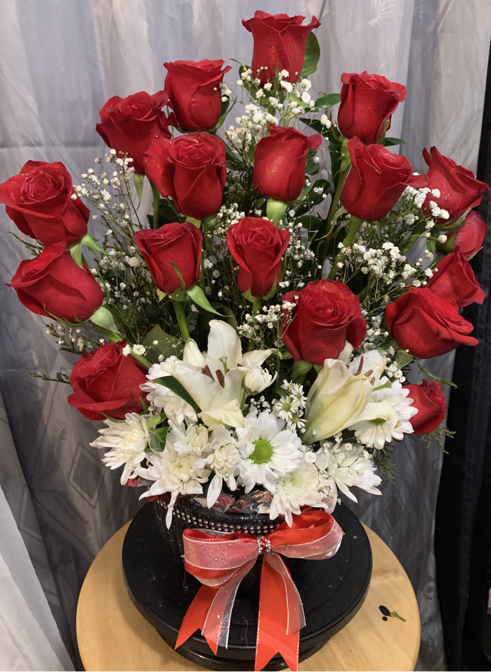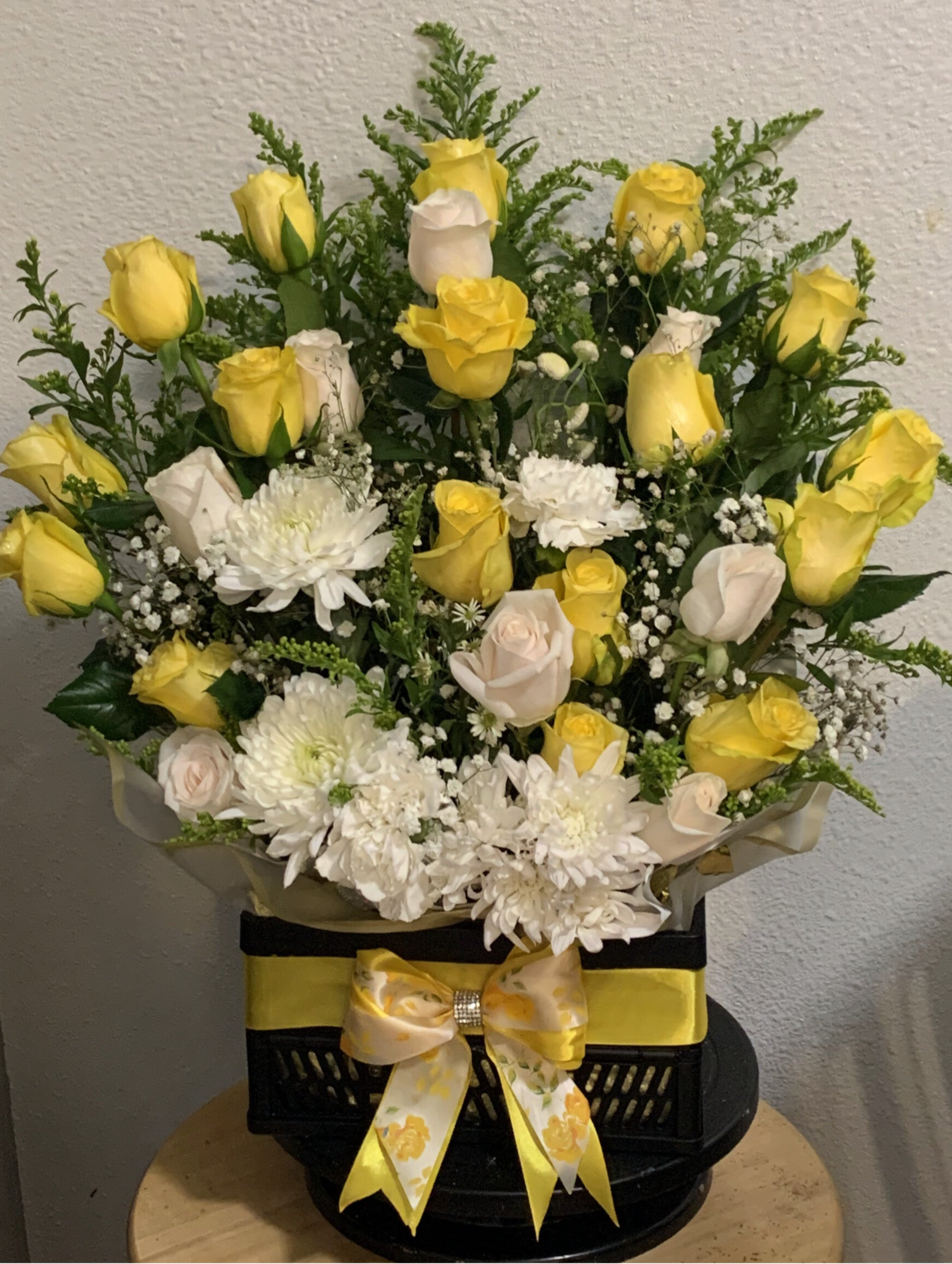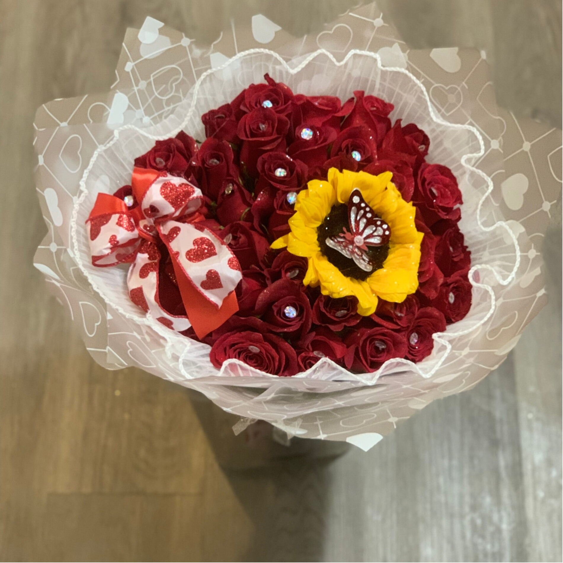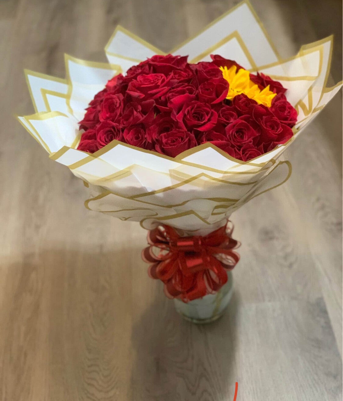 Ilumina tu día con nuestro elegante Arreglo "Amanecer". Diseñado para brindar alegría y calidez, este arreglo radiante cuenta con una mezcla armoniosa de girasoles, rosas rojas y flores blancas, cuidadosamente dispuestas para crear una explosión de color y positividad.