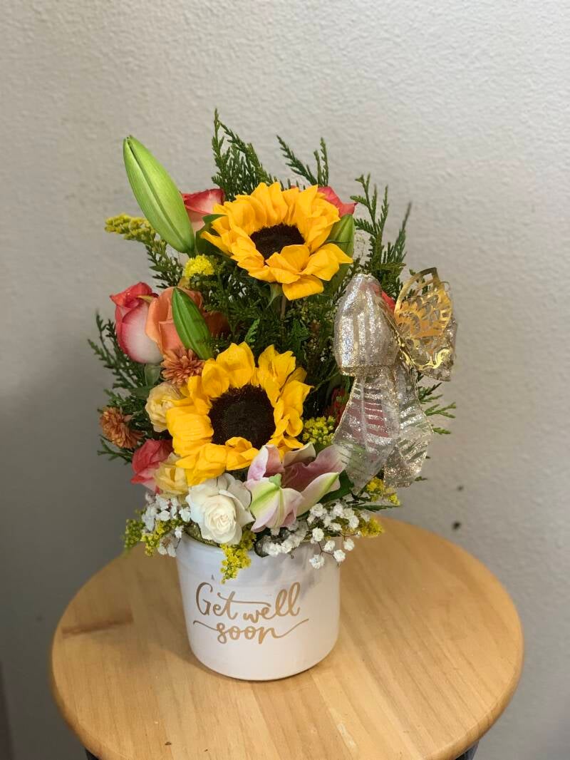 Brighten your day with our elegant Amanecer arrangement. Designed to bring joy and warmth, this radiant bouquet features a harmonious blend of sunflowers, red roses, and white blooms—carefully arranged to create an explosion of color and positivity.