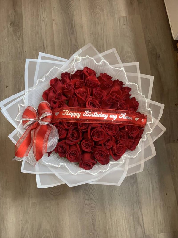 Buchón Bouquet Includes roses, butterfly-patterned wrapping paper, ribbon, and a custom sign.(extra cost for stuffed animal and chocolates already included)