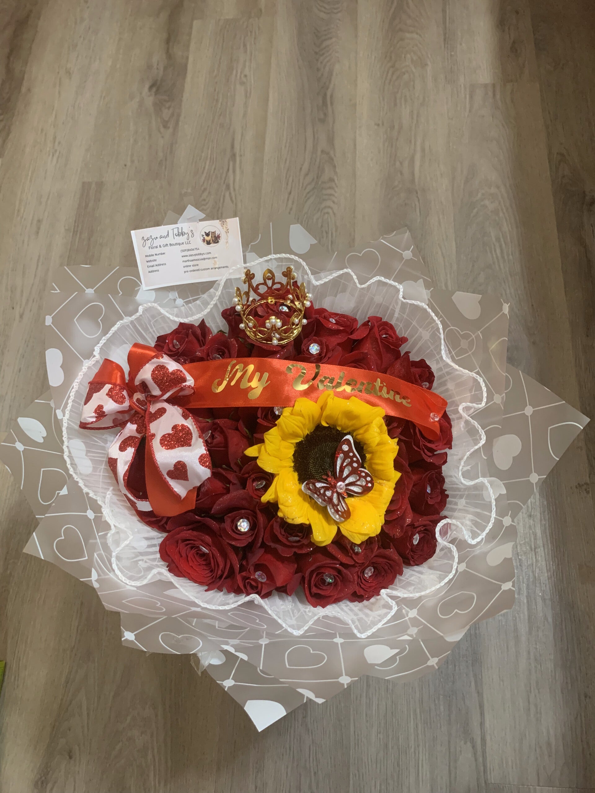 Ilumina tu día con nuestro elegante Arreglo "Amanecer". Diseñado para brindar alegría y calidez, este arreglo radiante cuenta con una mezcla armoniosa de girasoles, rosas rojas y flores blancas, cuidadosamente dispuestas para crear una explosión de color y positividad.