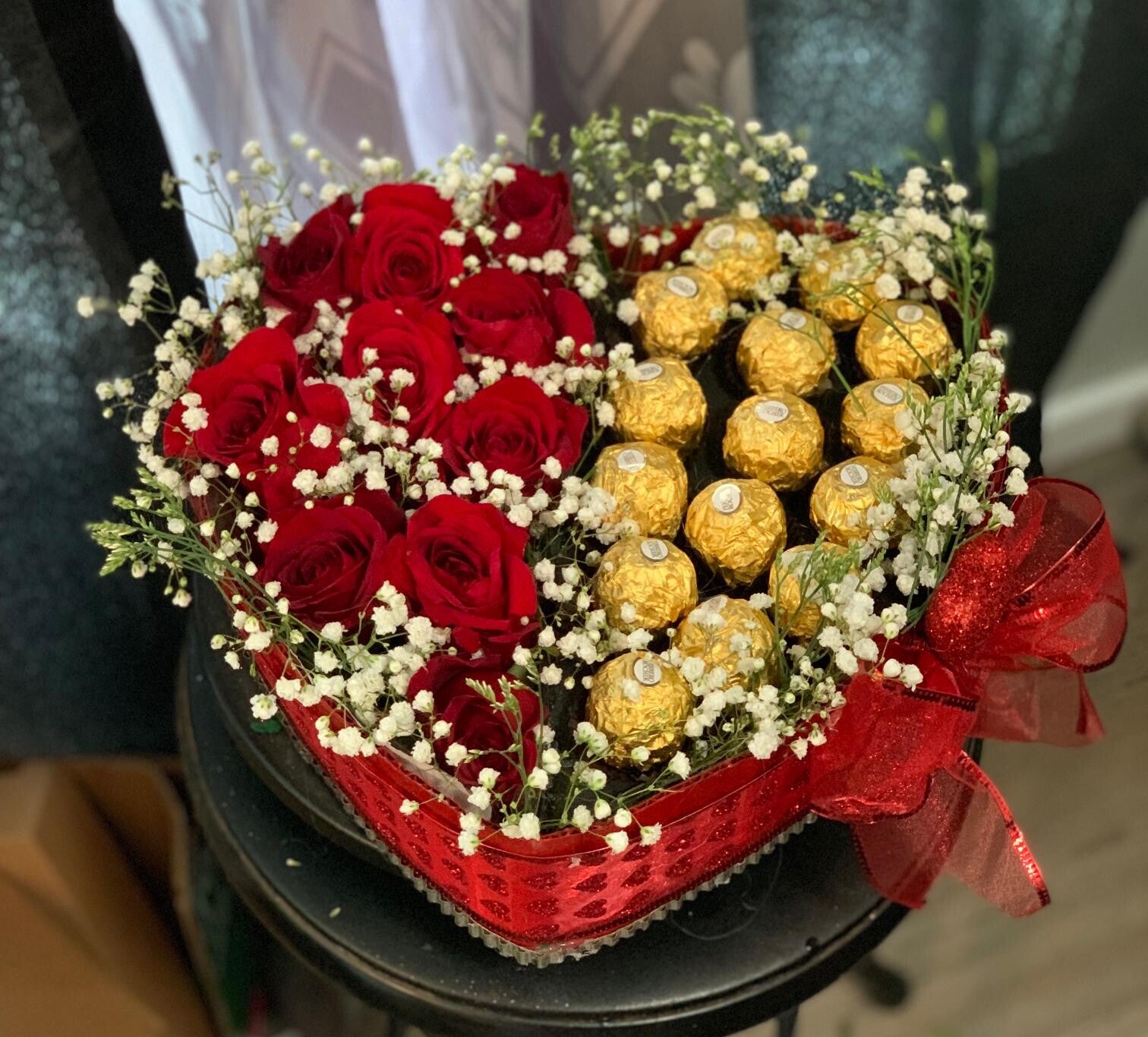 Heart with Chocolates Includes 12 roses and 12 chocolates, beautifully arranged in a heart-shaped base. A sweet and romantic gift—perfect for surprising someone with love.
